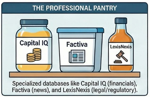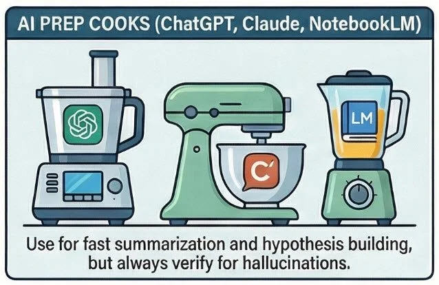 AI Tools (ChatGPT, Claude, NotebookLM) Think of AI as the prep cook. It's fast, it can summarize large amounts of text quickly, and it's great for early-stage hypothesis building. But AI can hallucinate confidently serving you a "fact" that simply isn't true. It also can't access proprietary databases, paywalled content, and even when it can search the web, it has no way to evaluate whether a source is authoritative, current, or complete. We use AI deliberately and verify everything it touches.