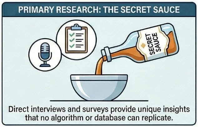 Primary Research Sometimes the most valuable ingredient isn't in any database. We conduct interviews, surveys, and focus groups when the question can only be answered by talking to real people. No algorithm replaces a candid conversation with someone who works in the industry.